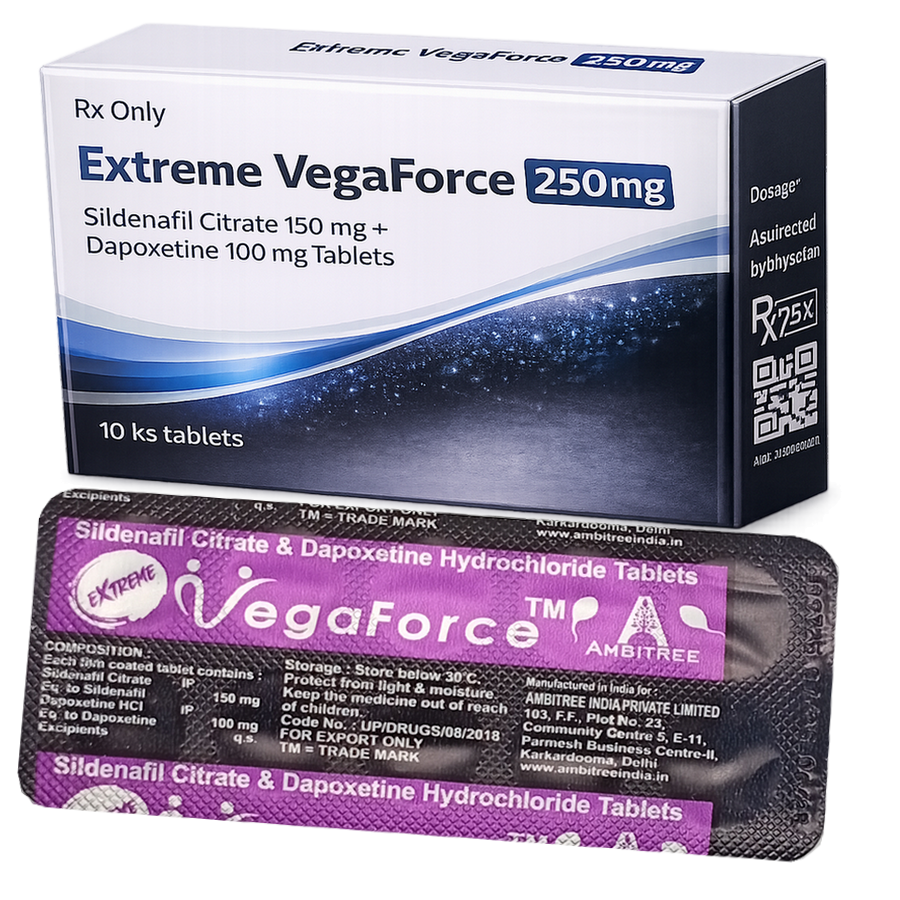 Exterme VegaForce 250mg je vylepšená Viagra 150mg o 100mg Dapoxetinu určená pre mužov ktorý majú problémy s predčasnou ejakuláciou.