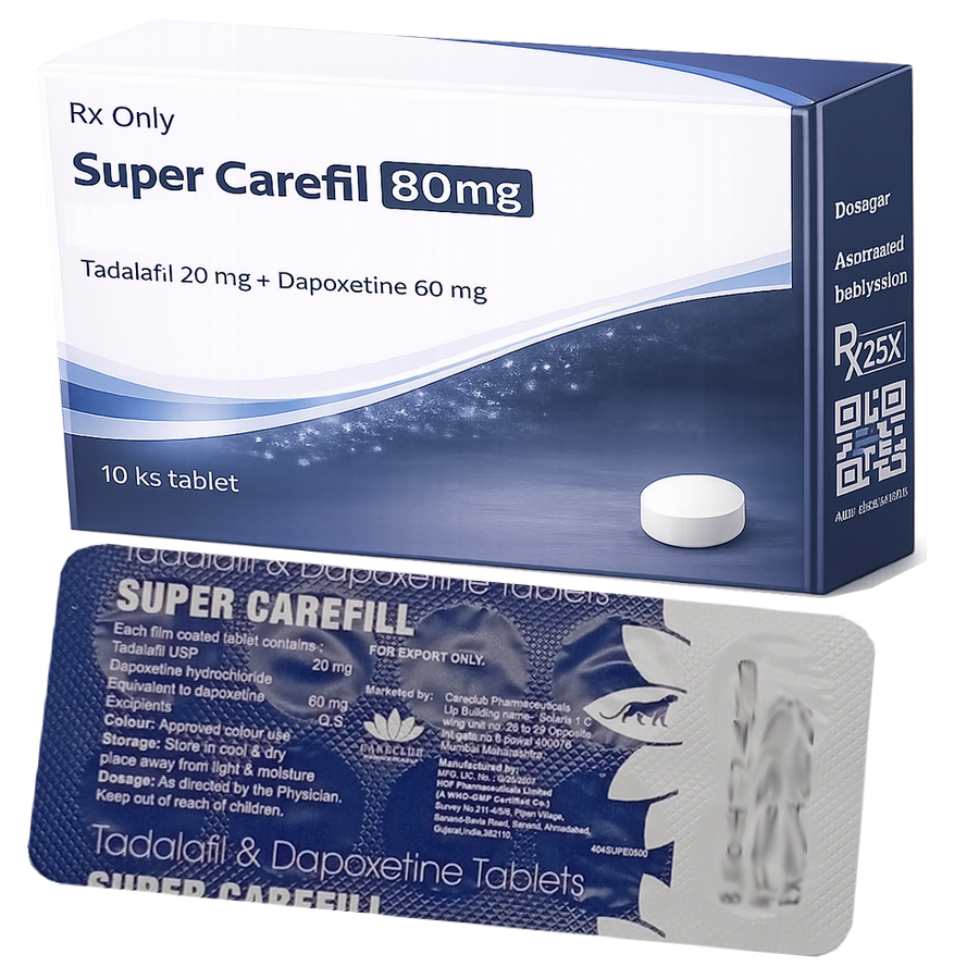 Účinné Látky: Jedna tableta Super Carefill 80mg obsahuje 20mg Tadalafil a 60mg Dapoxetine.