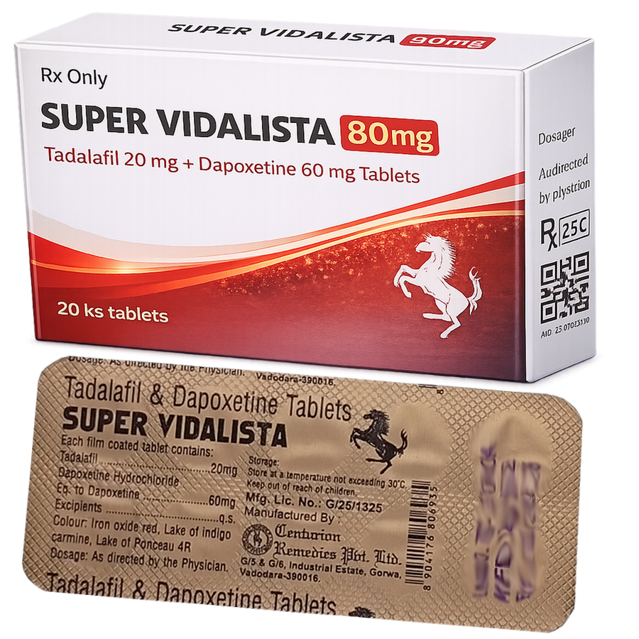 Účinné Látky:  Jedna tableta Super Vidalista 80mg obsahuje 20mg Tadalafil a 60mg Dapoxetine.